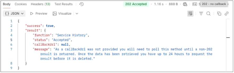 Once received you can monitor progress by polling the status endpoint or listening for a callback (such as a webhook) until the request is completed and a non 202 response is returned, at which point the endpoint should be called again to obtain the 200 response.